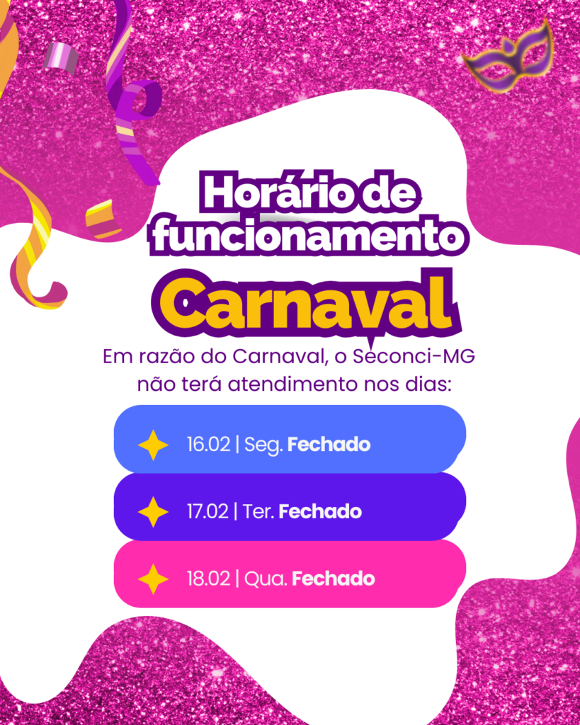 Informamos que no período de carnaval, não haverá expediente no Seconci-MG nos dias 16, 17 e 18 de fevereiro, respectivamente segunda, terça e quarta-feira, mediante compensação.