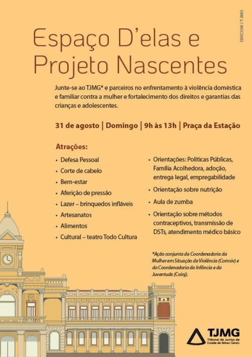 O Tribunal de Justiça de Minas Gerais (TJMG), por meio da Coordenadoria da Mulher em Situação de Violência Doméstica e Familiar (Comsiv) e da Coordenadoria da Infância e da Juventude (Coinj), promove, no próximo domingo (31/8), das 9h às 13h, uma grande ação de cidadania na Praça da Estação, no Centro de Belo Horizonte.