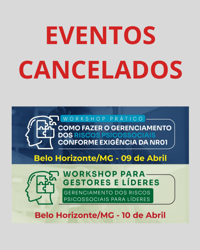 O Seconci-MG informa que os workshops sobre Gestão de Riscos Psicossociais, que seriam promovidos pela Revista Proteção nos dias 09 e 10 de abril, no Centro de Treinamento da entidade, foram cancelados.